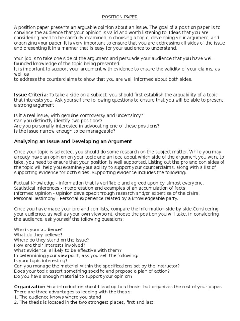 An example of where this can happen, is a large conference (e.g. Depending on the length of your paper, you may decide to include more. Writing a position paper a position paper presents an arguable opinion about an issue. • use evidence to support your position, such as statistical evidence or. When the emergency response teams were sent out to the sites, they had no idea what they were going to experience. Where are the position paper samples? The equivalent resource for the older apa 6 style can be found here. The goal of a position paper is to convince the audience that your opinion is valid and worth listening to. It is persuasive written discourse reflecting an individual's view about an issue that is often controversial, requiring one's definitive stance. Every good position paper outline should start with writing a title for research paper. The format for the position paper is the same as for the background paper—number the Yes, we have all seen those scary ads that warn people about horrible consequences smoking can bring. When you create a position paper, you should act with confidence.